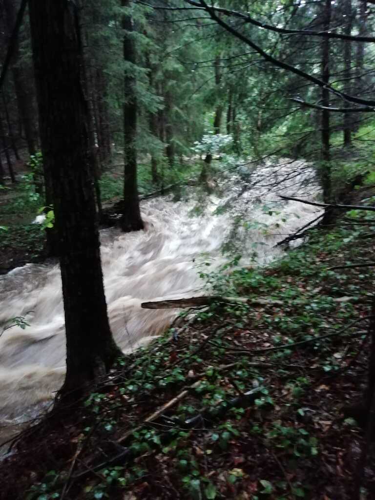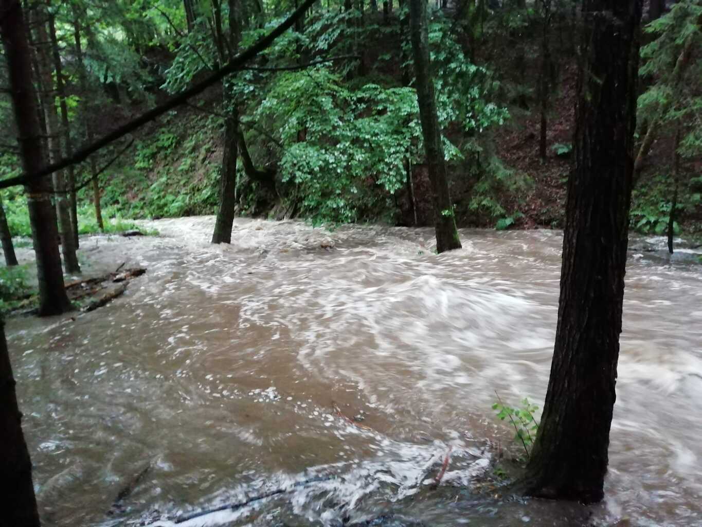 Unwetterweinsatz: Der starke Niederschlag auf den schon gesättigten Boden am Nachmittag und Abend des 18.7.2021 ließ die Kremnitz zu einem reißenden Gewässer ansteigen.