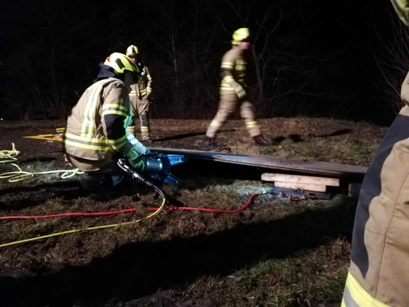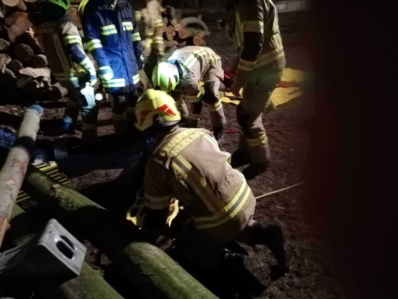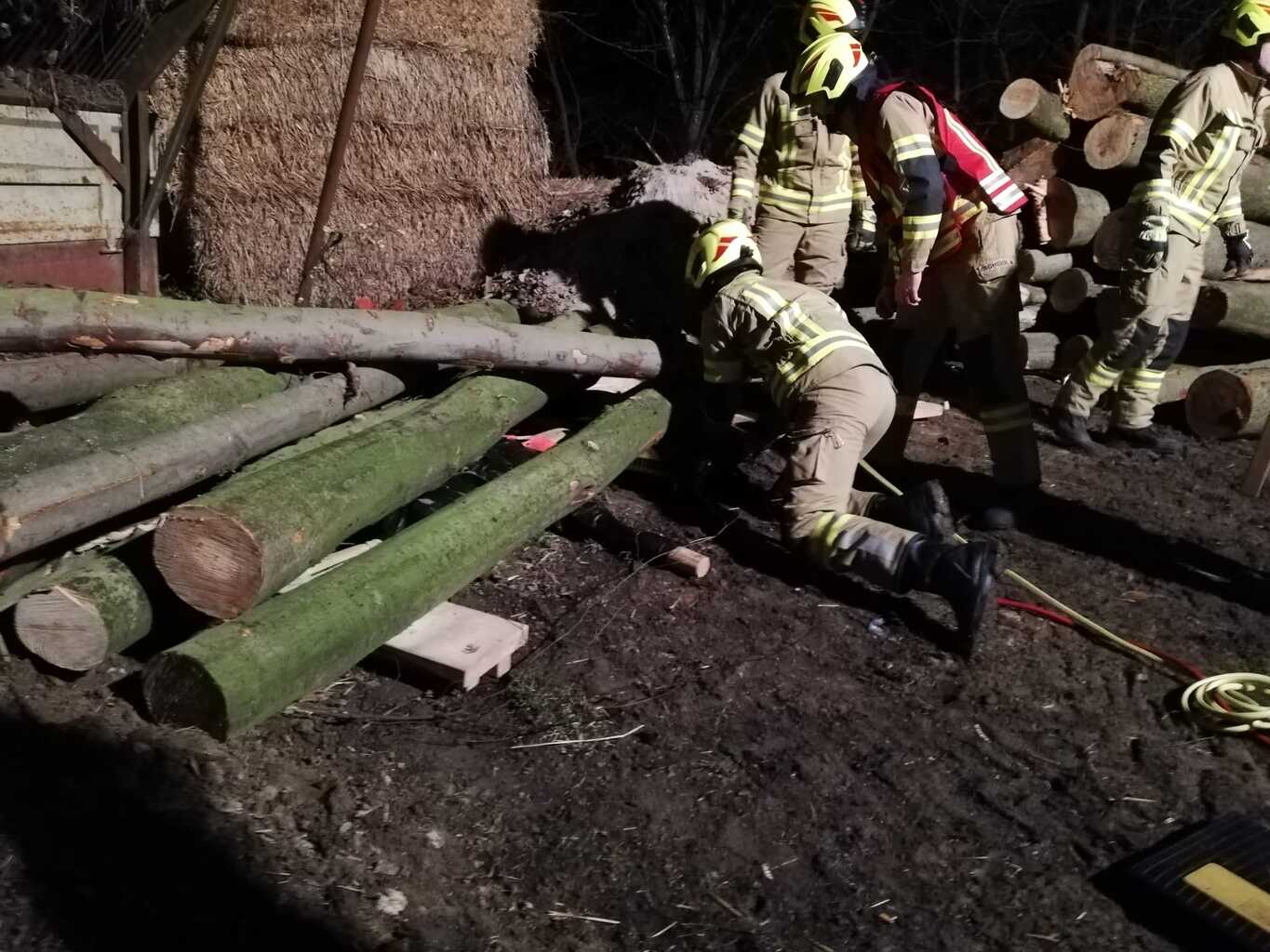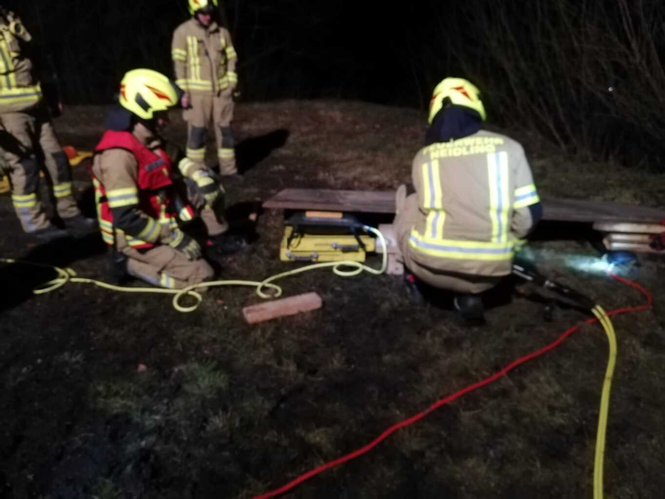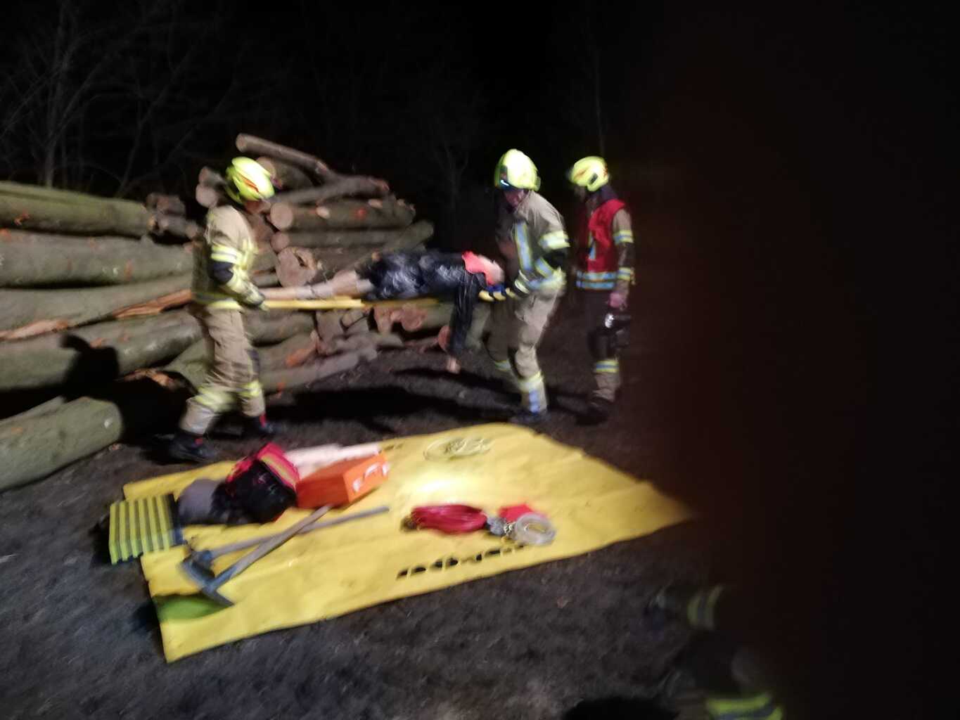 So auch bei der Gestrigen. Wie die Fotos zeigen, war ein Traktoranhänger umgekippt und zwei Personen wurden einerseits von großen Baumstämmen überrollt und andererseits kam eine Person in einem Schacht zu liegen. Dieser Schacht war durch vom Hänger gerutschte schwere Blechtafeln nicht frei zugänglich. Diese Fallbeispiele, die von Stefan Götzinger und Stefan Steindl vorbereitet waren dienten den Umgang mit Hebewerkzeug zu zeigen und zu verfestigen.